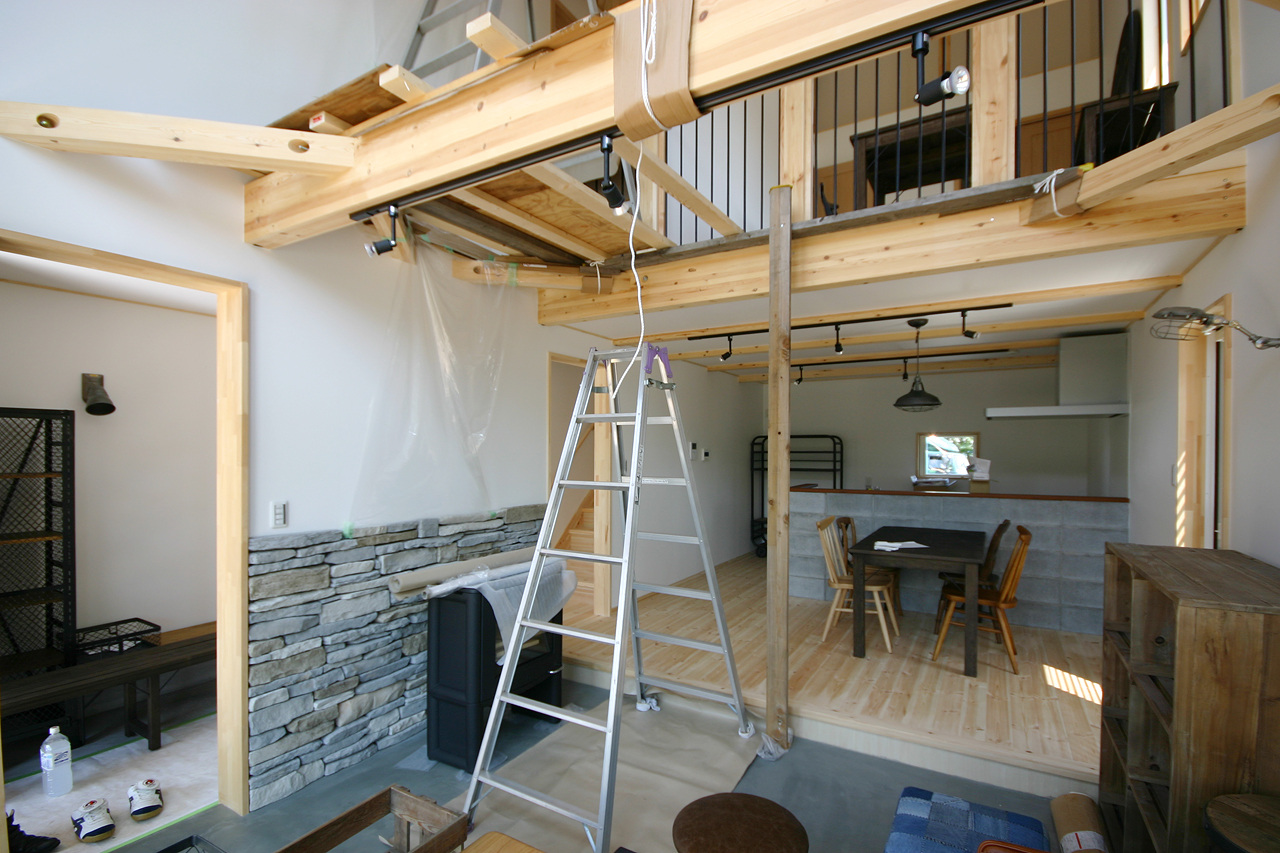 これが吹き抜けのあるリビング。薪ストーブ一台あれば、家中あったかい設計です。