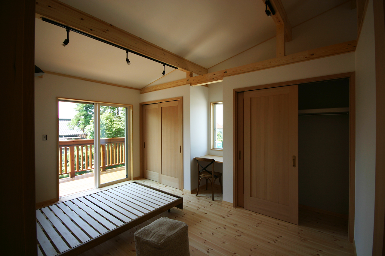 そしてウッドデッキに出られる寝室。緑が見えて、風は抜けるし、いい感じ。