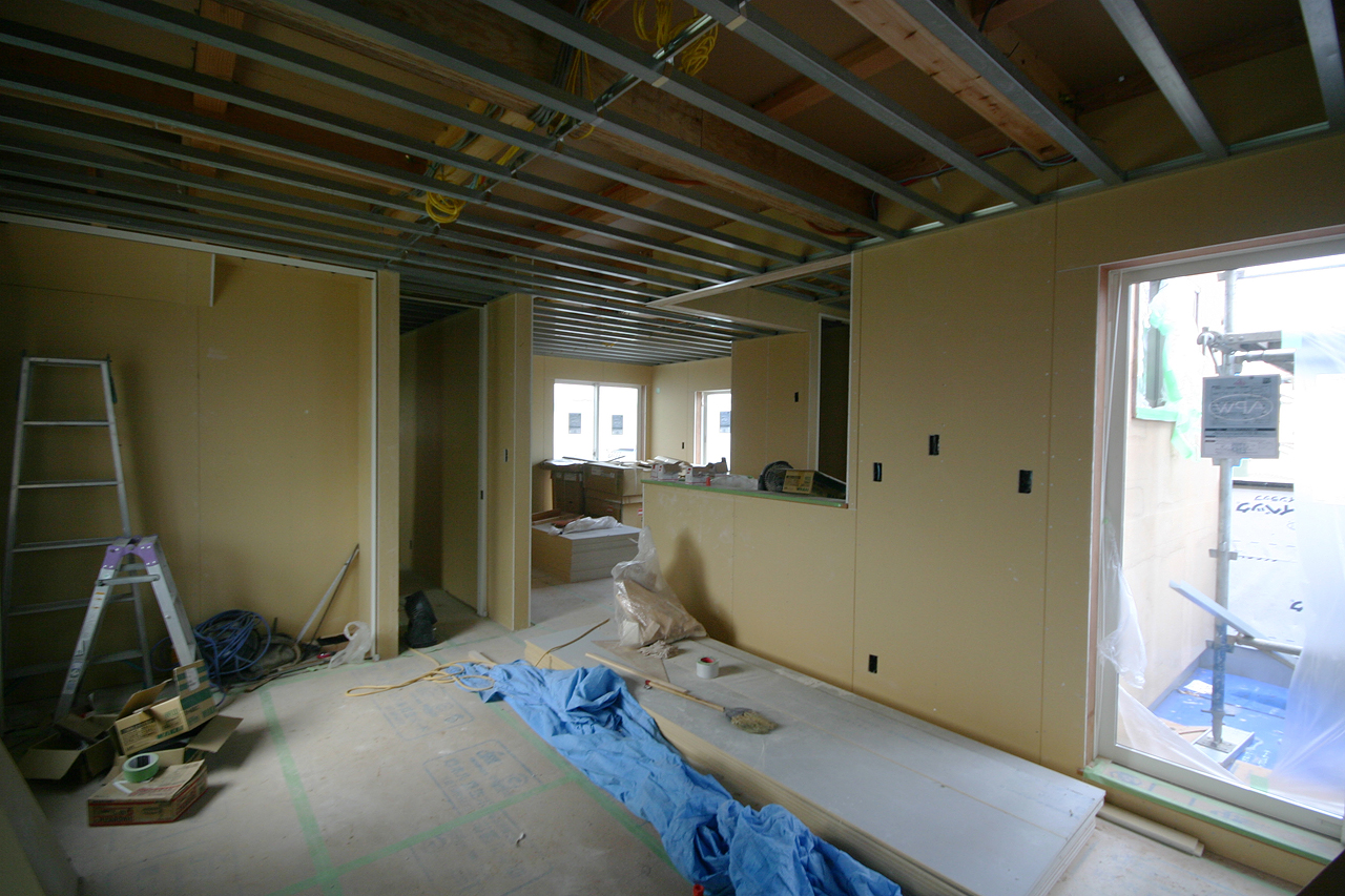 ここは二階に配置したLDK。工事中なんでちょっと暗い感じがしてますけど、