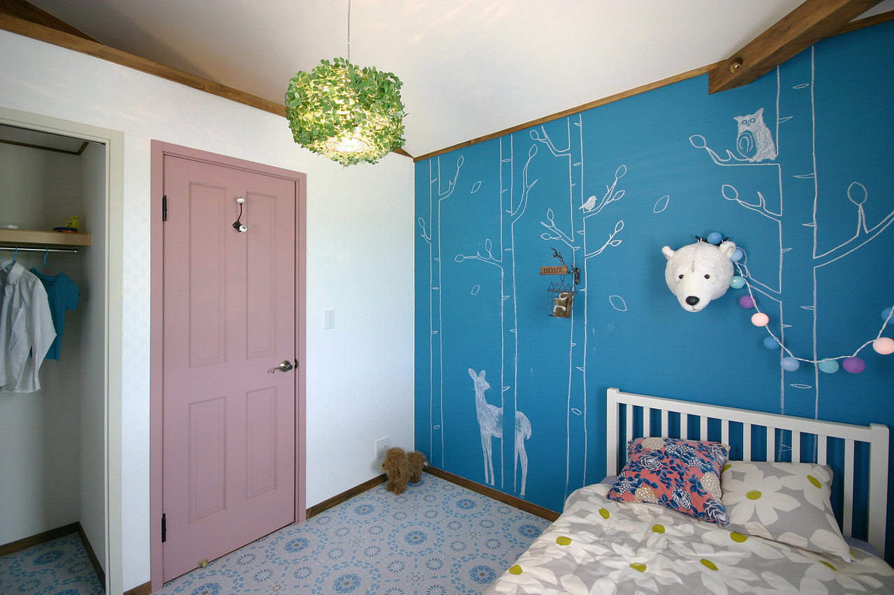 青い壁も、最近人気の黒板塗料。色んな色があるんですね。