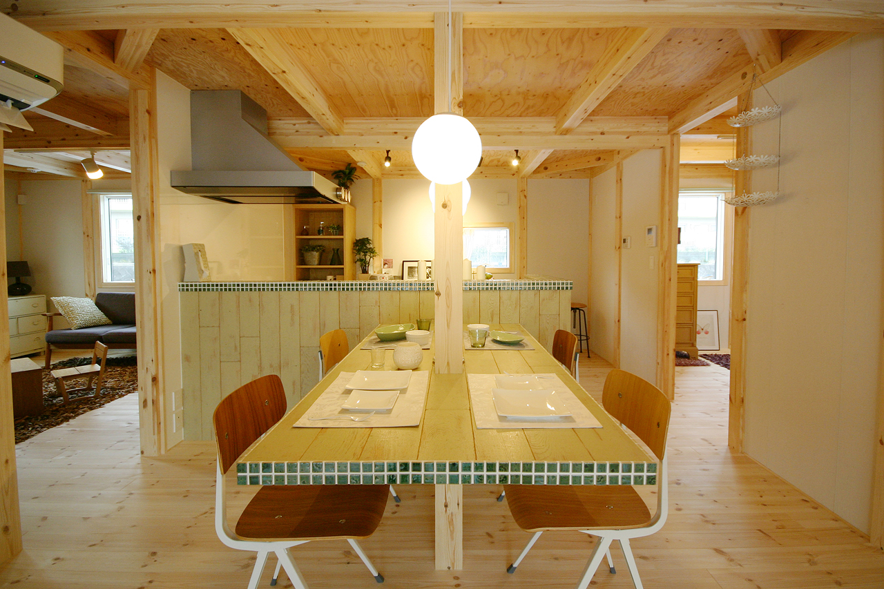 ダイニングテーブルとキッチン前の腰壁には、