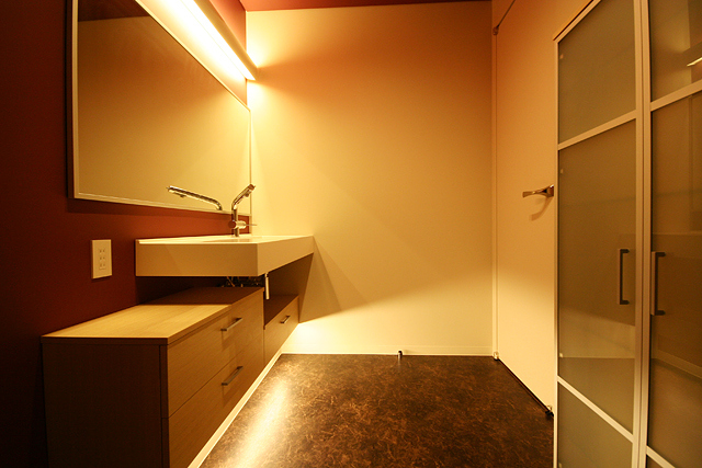 洗面化粧台を取り付ける壁に色を入れてるのは、