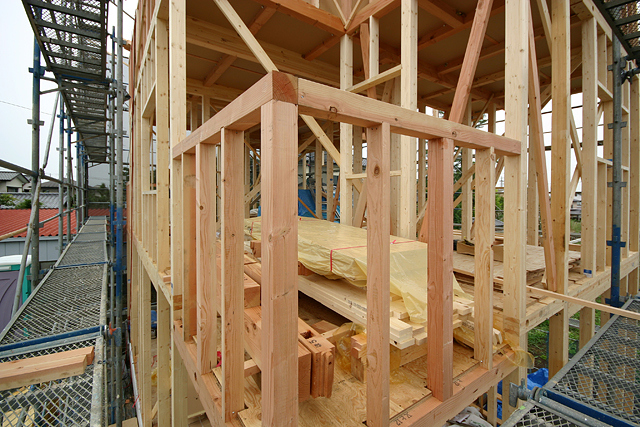 柱、梁を組み上げた後に、このダイライトで建物全体を包んで、